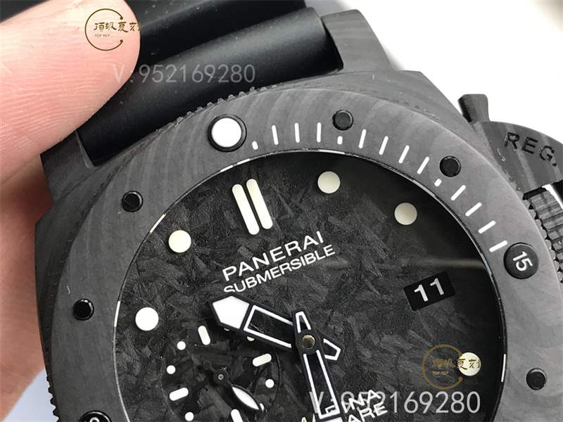 VS廠沛納海PAM979,字面是采用了碳纖維的字面,這是沛納海第一個使用這種字面,全文由兩塊碳纖維材料制成(九點是小秒盤)。這種帶有碳纖維外殼的碳纖維看起來更有科學和技術感。仔細看一下表盤、藍寶石玻璃鏡的細節,這種材料不必說,玻璃的通透性和耐磨性也是可能非常的高的,外圈是可單向旋轉的,表圈上印有縱向線的碳纖維啞光質地,表圈上的藍色夜光明珠完全對應盤尺度的顏色。圓盤刻度上充滿了夜光涂層,而鏤心劍形時針和分針設計也填充了夜光涂層。方便夜間清晰閱讀時,在3點位有一個日歷窗口,框架的形狀與正品的一致,日歷字體也沒有不同。9點是一個小秒盤的設計,它也是一個像979這樣的雙色夜光。