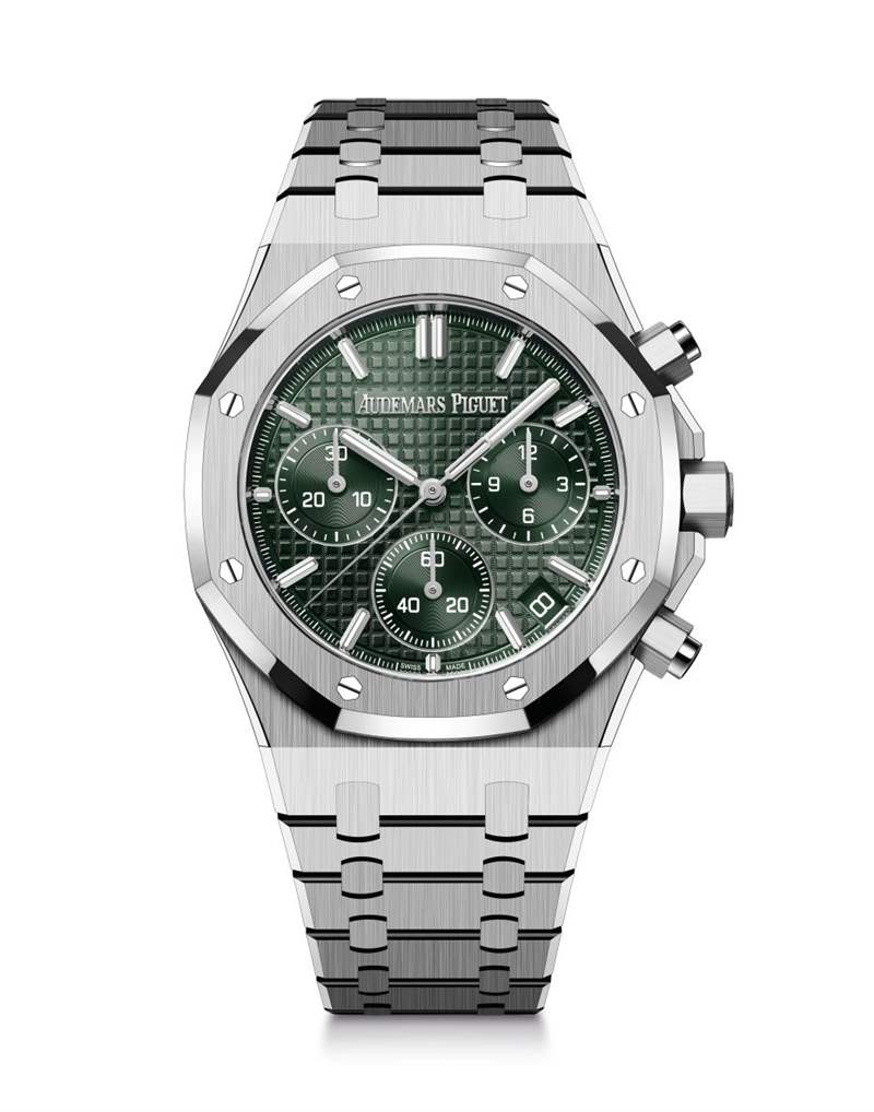 Royal Oak皇家橡樹系列自動上鏈計時碼表,41mm,精鋼表殼,軍綠色表面鐫刻「Grande Tapisserie」大型格紋裝飾圖案,搭載4401自動上鏈機芯,計時碼表搭載飛返功能、小時、分鐘、小秒針與日期顯示,Audemars Piguet。