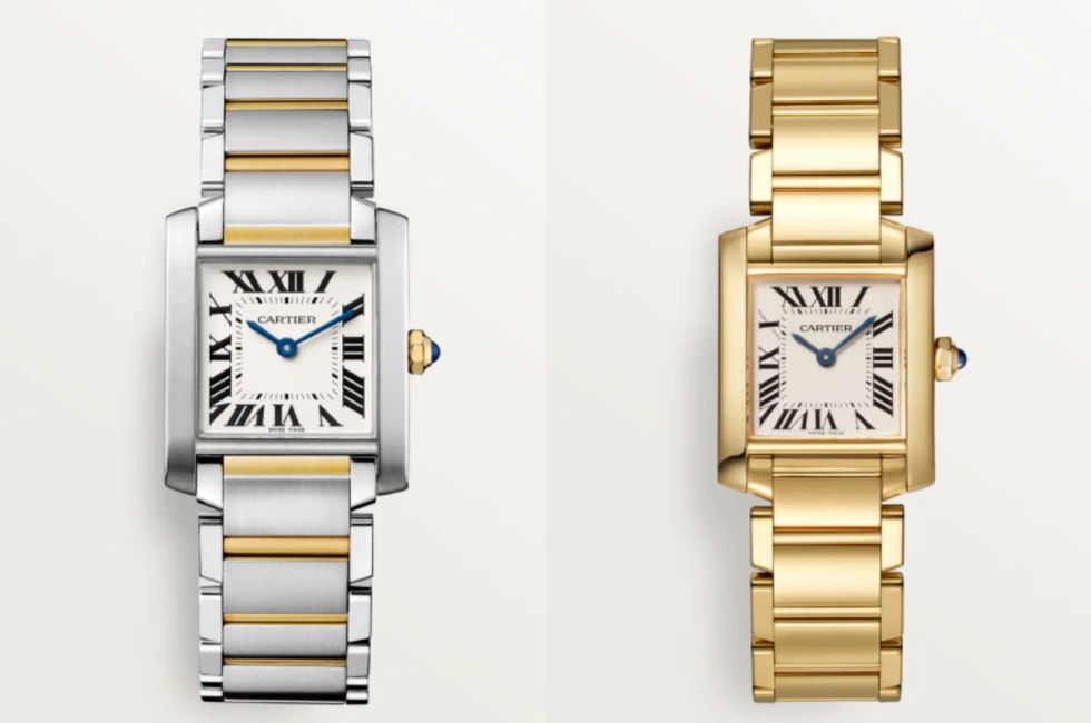▲(左)Tank Fran?aise腕表,中型款,石英機芯,精鋼表殼,黃K金八角形表冠鑲嵌一顆凸圓形合成尖晶石,鍍銀粒面表盤,雙色表鏈,表殼尺寸:30毫米x25毫米,Cartier。