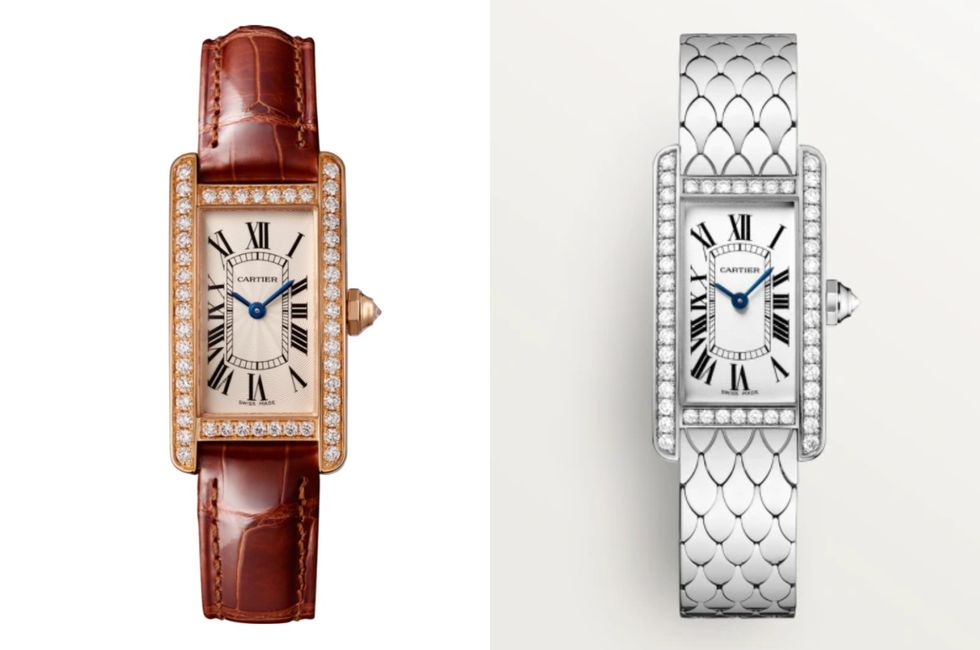 ▲(右)Tank Américaine腕表,小型款,石英機芯。鍍銠18K白K金表殼和九邊形表冠鑲鉆,鍍銀透明琺瑯雕紋表盤,鍍銠18K白K金表鏈,表殼尺寸:34.8毫米x19.0毫米