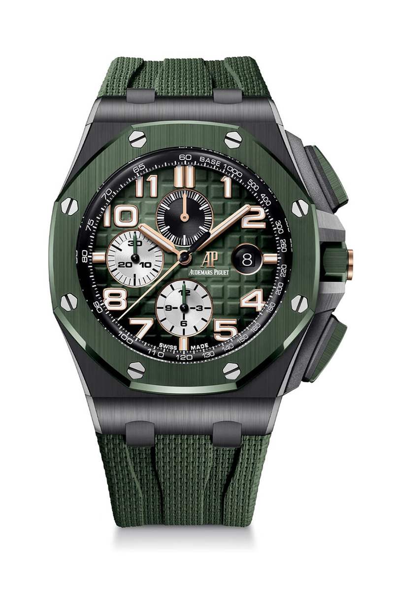 皇家橡樹離岸型自動上鏈計時碼表的這三款全新款式采用 44 毫米實心陶瓷制成,一如既往地堅固且高科技。然而,與通常的黑色、隱秘光澤的材料不同,愛彼用藍色陶瓷、綠色陶瓷或玫瑰金來提升東西。
