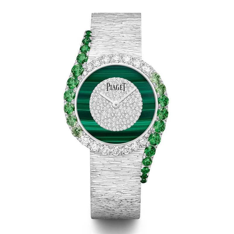 Limelight Gala也是伯爵上半年度的主力系列,雖然Limelight Gala向來(lái)都是可以素雅也可以華麗的呈現(xiàn),但因?yàn)樗谋須ぴ煨土Φ篮軌颍浅_m合用多彩寶石去呈現(xiàn),凸顯流暢線條帶出的視覺(jué)張力,今年這款以沙弗萊石搭配孔雀石面盤(pán)的新作,就是很能烘托Limelight Gala設(shè)計(jì)特色的搭配。表殼上沙弗萊石從淺到深、由小到大的漸變呈現(xiàn)方式很細(xì)致,鏈帶則是伯爵擅長(zhǎng)的宮廷式鏈帶裝飾,載在手上就像在銀色晚禮服縫制上綠色滾邊的裙擺,能隨著身體的輕擺搖曳出搶眼卻不浮夸的姿態(tài)。