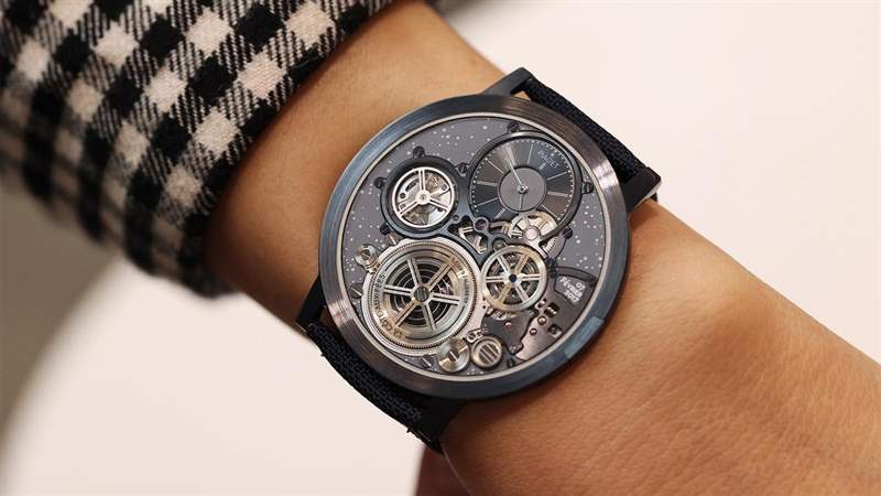 伯爵的制表師們回溯起Altiplano Ultimate Concept的誕生,生日是2017年2月7日,機(jī)芯開(kāi)始運(yùn)作、指針跟著走動(dòng)的時(shí)間是早上7點(diǎn)47分,地點(diǎn)是在仙子坡的制表工坊La C?te-aux-Fées。制表師像接生的醫(yī)生一樣,用這些數(shù)字幫Altiplano Ultimate Concept列了一張出生證明,生日在兩點(diǎn)鐘位置的橋板上、表廠的所在地和座標(biāo)列在六點(diǎn)鐘位置的棘輪,仔細(xì)看時(shí)分盤(pán)則可以看到7:47的時(shí)間用兩個(gè)空心圓點(diǎn)做為線索,連十二點(diǎn)鐘位置的PIAGET Logo用的也不是現(xiàn)行的襯線字體而是早期的設(shè)計(jì)。夾板這次特別以Super-LumiNova做了點(diǎn)狀夜光,象征Altiplano Ultimate Concept誕生那天仙子坡的星空。