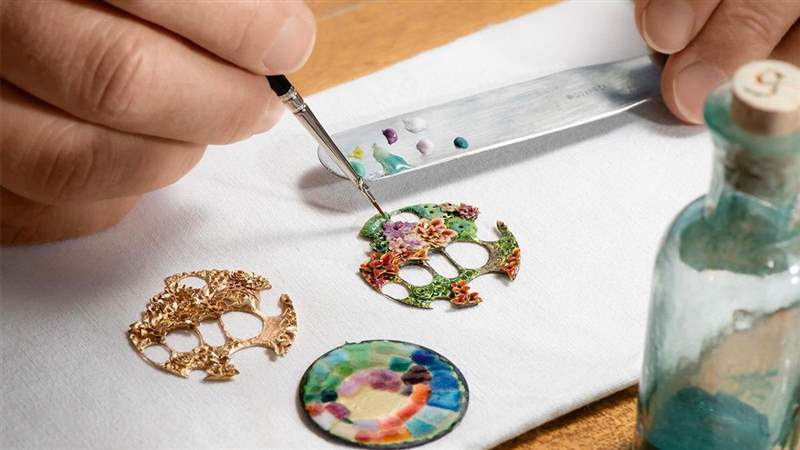 今年是伯爵玫瑰誕生的40周年,伯爵也以玫瑰為主題,推出這款集結(jié)寶石雕刻、金雕和琺瑯的Altiplano工藝表款。面盤(pán)上的伯爵玫瑰以寶石雕花和琺瑯交錯(cuò)呈現(xiàn),工藝上最難的部分在于要在金雕支架旁邊涂上琺瑯?lè)勰瓦M(jìn)爐烤高溫?zé)迫缓蟛荒茏屵吘墴梗虼朔浅?简?yàn)琺瑯工匠的技術(shù)功力,但因?yàn)椴俚兜氖谴髱烝nita Porchet本人,所以還有什么好擔(dān)心的呢。