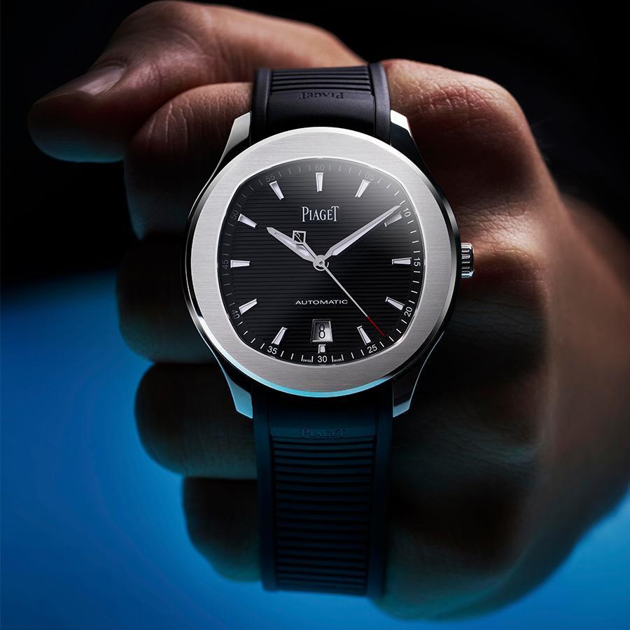 Polo一開(kāi)始的路線比較偏向正裝斯文感,一來(lái)是因?yàn)榭钍蕉喟胧撬厣樆究罨蚴晴U空工藝款,即便是計(jì)時(shí)碼表早先搭的也以鏈帶和皮帶為主,后續(xù)才開(kāi)始出現(xiàn)橡膠表帶的選項(xiàng)。今年的黑面大三針日期版本,也搭上延續(xù)面盤(pán)橫紋的橡膠表帶看上去就像輪胎的象征,搭配秒針末端的紅色區(qū)段彰顯出競(jìng)速感,表帶還加入與時(shí)俱進(jìn)的快拆設(shè)計(jì),為搭配性加入更活用的可能。