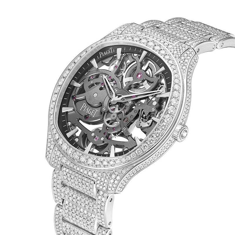 伯爵今年將Polo Skeleton鏤空款推向奢華版的路線,之前的Polo Skeleton大致上是夾板鍍色搭配表殼材質(zhì)或表圈鑲鉆去做變化,而今年則是推出滿鉆版本,將表殼和鏈帶鑲滿了鉆石,搭的依舊是1200自動(dòng)上鏈機(jī)芯。之前的1200幾乎都只搭在Altiplano系列,后來(lái)Polo Skeleton也開(kāi)始使用這枚機(jī)芯去做變化,1200S1的S則是Skeleton鏤空的意思,將同一枚機(jī)芯針對(duì)不同款式做出不一樣的差異。