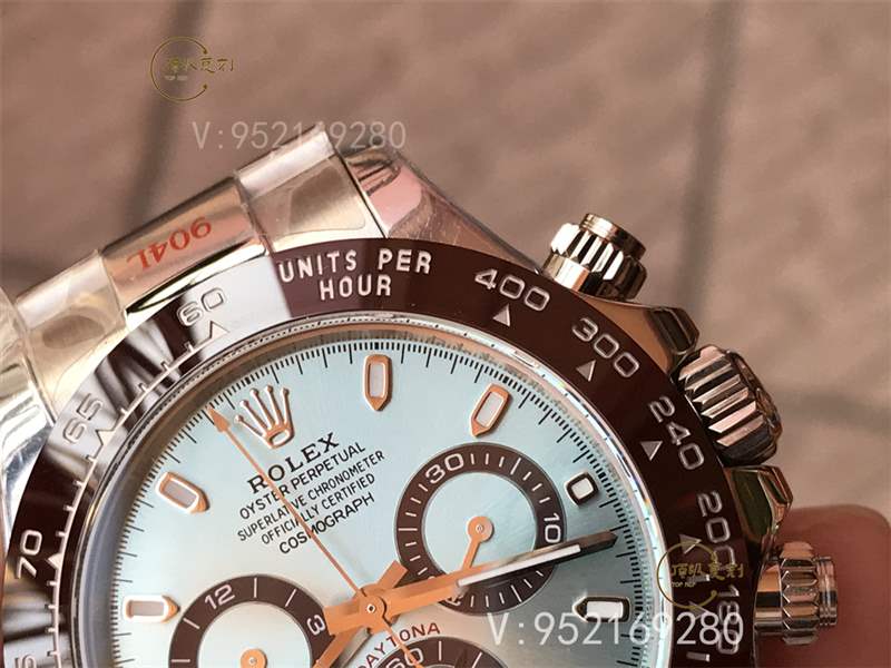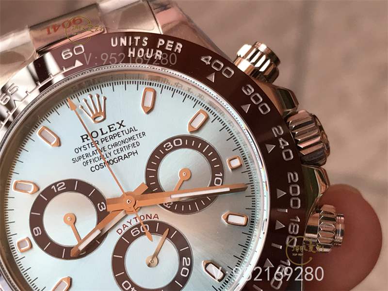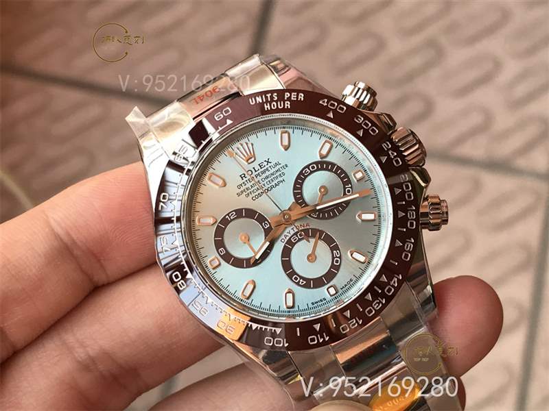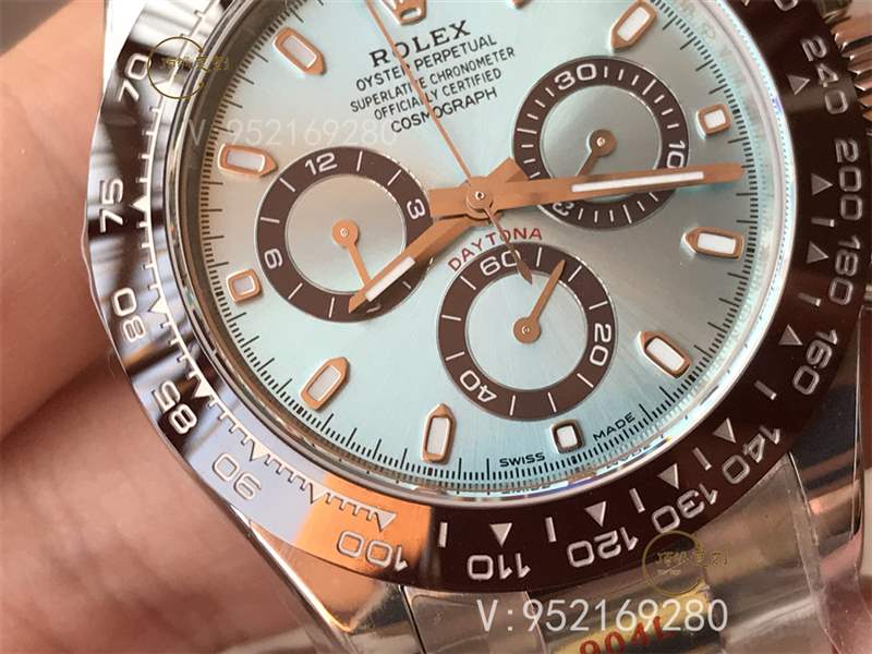 這款勞力士冰藍迪在市場上賣的非常火,主要還是它冰藍色的盤面和票棕色的表圈,十分吸人眼球,正品價格在60w左右。
