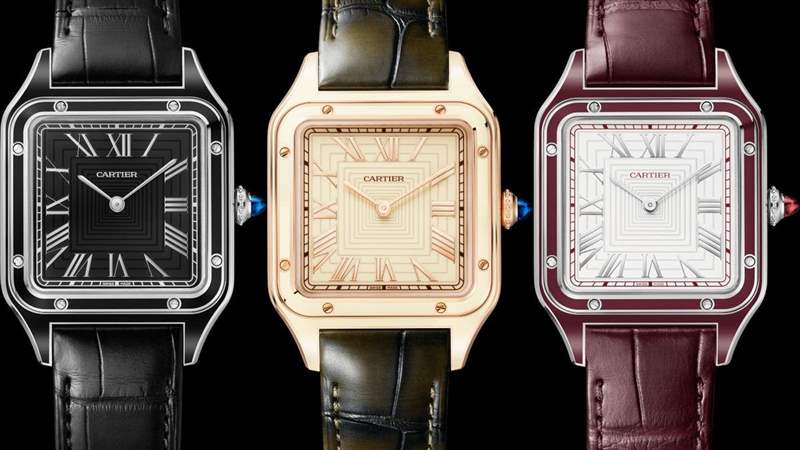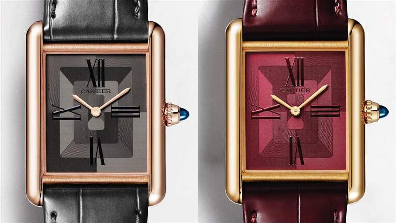 另外兩款Tank Louis Cartier的面盤顏色變化是比較有層次的呈現(xiàn),1980年代的Must de Cartier除了黑、紅等單色面盤之外,方中有方的多色金幾何圖案也是經(jīng)典表面。卡地亞今年重新解構(gòu)了這個(gè)設(shè)計(jì),以電鍍鐫刻技術(shù)印出不同方向的直紋,紅面以漆藝上色、灰面的顏色則是經(jīng)由電鍍處理,四個(gè)定位點(diǎn)處的時(shí)標(biāo)也巧妙形成飄浮感的面盤裝飾,加上亮面轉(zhuǎn)印的作法讓整個(gè)面盤看起來十分有立體感。