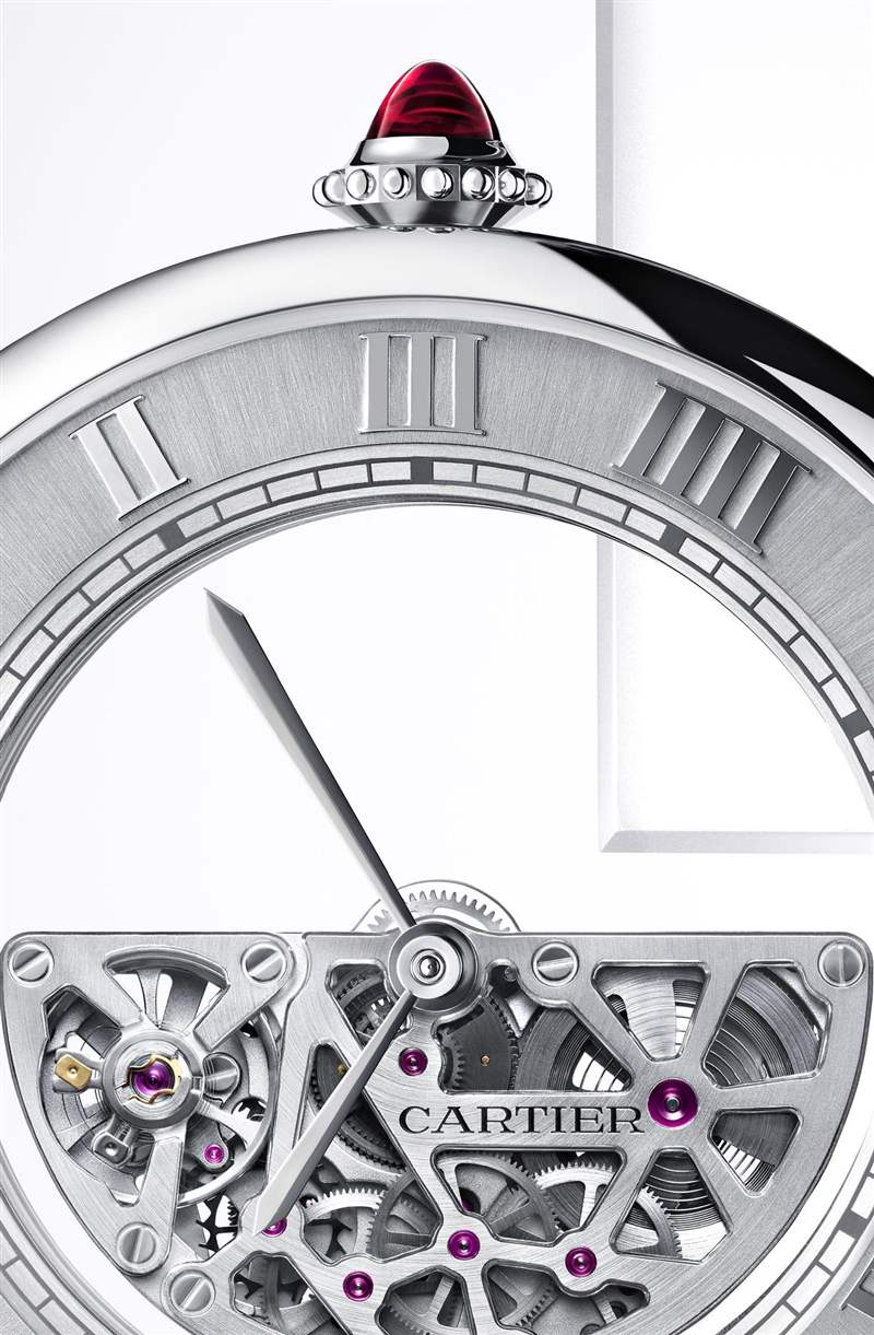 Masse Mystérieuse把輪系結(jié)構(gòu)都整合在半圓型的自動(dòng)盤里,搭載的是卡地亞全新研發(fā)的9801 MC型自動(dòng)上鏈鏤空機(jī)芯,是以鏤空結(jié)合神秘鐘概念的自動(dòng)上鏈機(jī)芯,整個(gè)自動(dòng)盤(和機(jī)芯)在隨著手腕擺動(dòng)的同時(shí)也會(huì)跟著360度轉(zhuǎn)動(dòng),加上自動(dòng)盤還以鏤空方式露出下方輪系,通透加鏤空的做法自然很有視覺效果。在這邊卡地亞用了多片藍(lán)寶石水晶去固定不同的部件,除了鏡面和底蓋之外,時(shí)針、分針、自動(dòng)盤、還有被自動(dòng)盤繞著轉(zhuǎn)的固定輪,都用了藍(lán)寶石水晶去固定。時(shí)分針同樣是透過藍(lán)寶石水晶片和表冠連動(dòng)以調(diào)校時(shí)間,不過因?yàn)檩喯翟O(shè)計(jì)的關(guān)系,表冠在這里單純是設(shè)定時(shí)間的功用,并不能用來手上鏈,上鏈的工作透過自動(dòng)盤運(yùn)作,然后上鏈系統(tǒng)再透過差動(dòng)輪連動(dòng)指針去驅(qū)動(dòng)走時(shí)。寫到這忍不住又贊嘆了起來,這就是卡地亞復(fù)雜功能應(yīng)該發(fā)展的方向啊,因?yàn)樗强ǖ貋啠圆拍躆asse Mystérieuse。