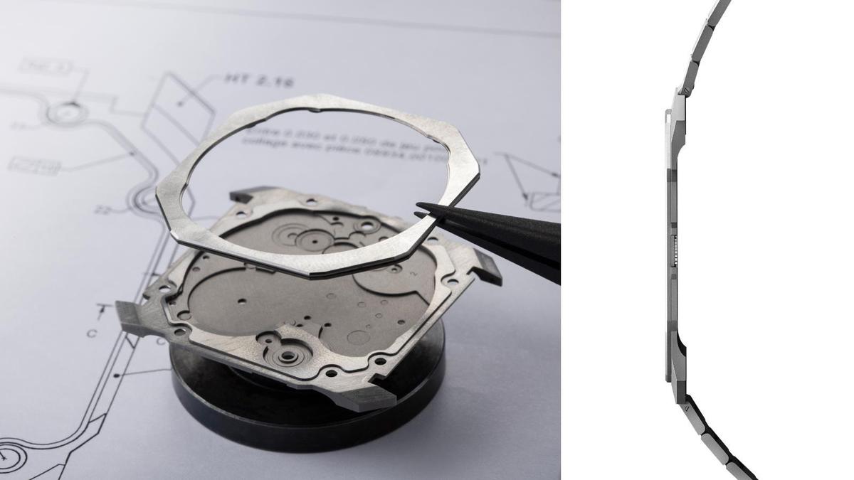 寶格麗產(chǎn)品設(shè)計執(zhí)行總監(jiān)Fabrizio Buonamassa Stigliani之前也受訪時提過,寶格麗很在意鏈帶的設(shè)計,因為那是手表最大面積貼近皮膚的部分,所以一定要講求舒適感才行。為了更薄這款Octo Finissimo Ultra的鏈帶也經(jīng)過重新設(shè)計,厚度只有原版Octo Finissimo表鏈的一半,因此折疊扣也要跟著變動。再來要解決的問題是整體的硬度,畢竟表殼做得這么薄,組件硬度一定要跟著強(qiáng)化,所以表殼中層、表圈、表耳等等都用了碳化鎢強(qiáng)化性能。