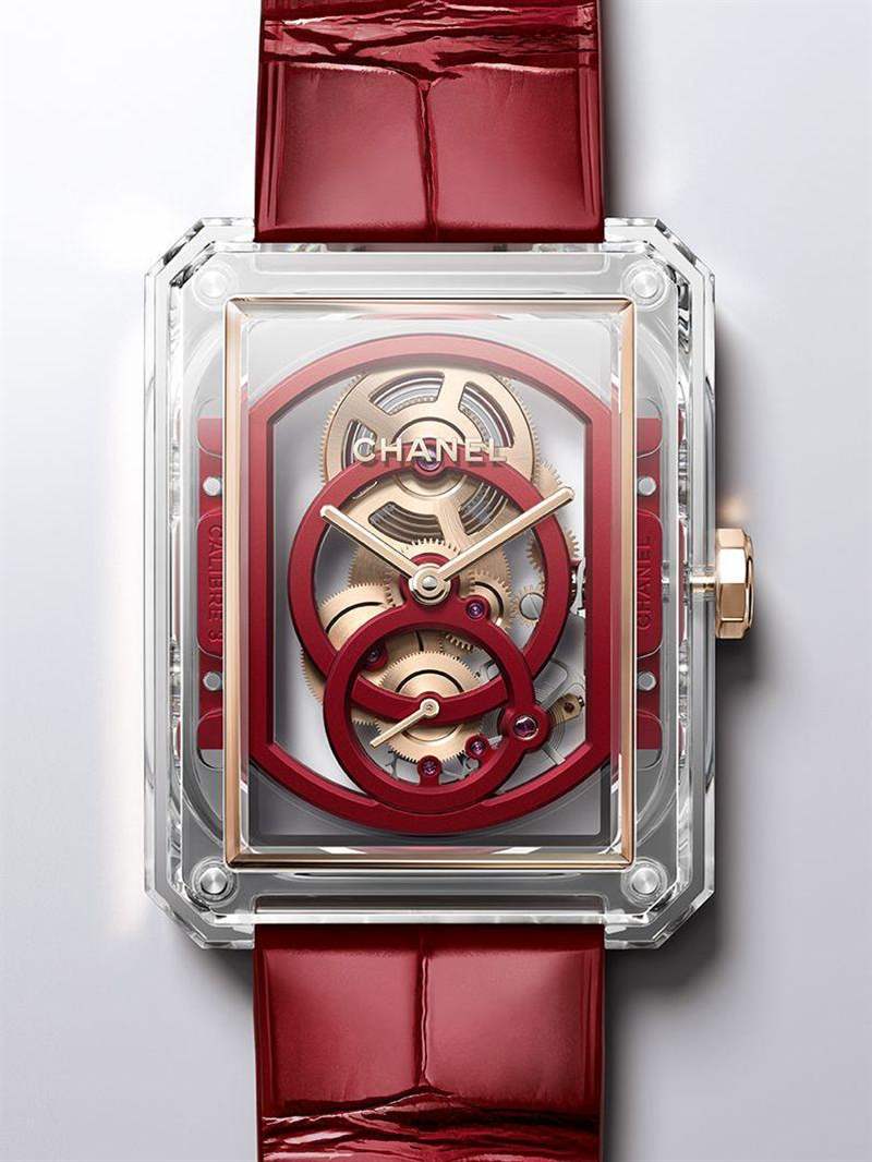 - 香奈兒的大型方形表款Boy·Friendf系列,去年推出鏤空機芯結合水晶表殼的全透明表款,技驚四座,是第一個跨入藍寶石水晶透視領域的時尚品牌。而最近她們推出「紅色主題」,在鏤空機芯橋板施以紅色涂層,同時還在表冠、機芯零件與表殼方形內層做Beige Gold「米色金」的香奈兒專屬黃金材質,在水晶殼中閃閃發亮。限量100只。