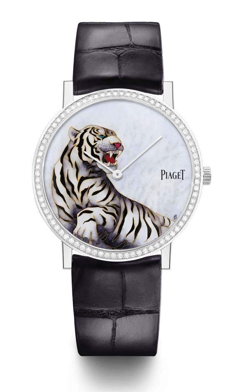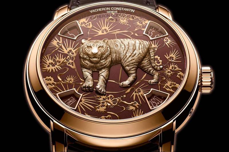 - 江詩丹頓「藝術大師」年度生肖表,是收藏家每年必收的作品。今年的虎年表,有玫瑰金與鉑金二種款式。其面盤融入多種工藝,先手工雕刻花葉裝飾圖案,再以半嵌入式方式將深淺不同的浮雕組出層次,使之有如懸浮于表盤上,覆上大明火琺瑯,再鑲上手工金雕的「老虎」。立體感分明,老虎的神情有種特殊的韻味。各限量12只。