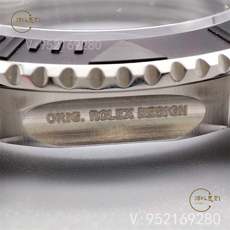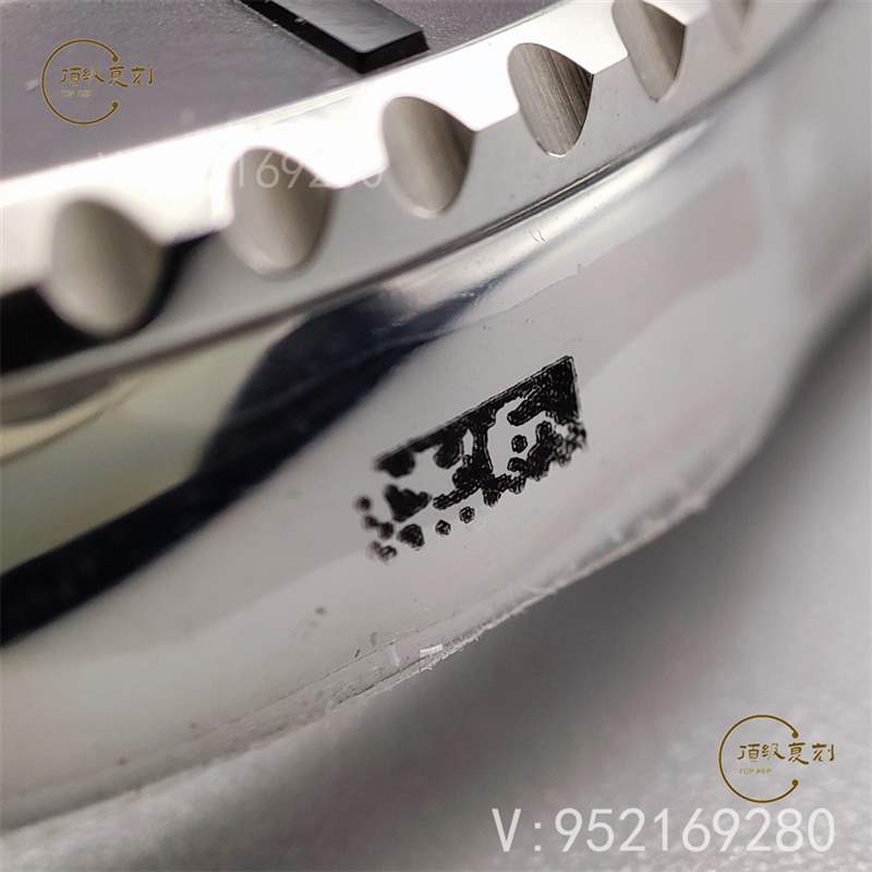 外殼金屬加工工藝成熟,牙圈豁口做工同樣很漂亮,轉動表圈防滑效果很好,同時豁口也進行了拋光潤飾。表冠VS采用勞力士專利三扣鎖三重防水系統,牢固旋緊于表殼。表冠護肩與中層表殼融為一體,以保護上鏈表冠。表殼內部刻字,表扣的刻字以及原裝該有的數字VS都做到了一比一的復制,而且字體清晰可見,字體形態基本保持一致,這里有興趣的表迷可以觀察下面圖片,我們有詳細實拍圖供大家參考。
