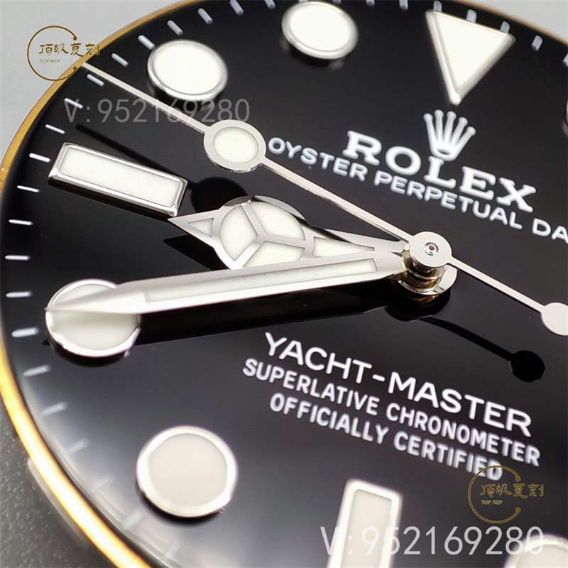 盤面細致做工,盤面風格依舊屬于勞力士典型設計,這也是最好辨別勞力士手表的地方,特大指針與鐘點標記上涂有夜光物料確保讀時清晰,實心中軸,字體印刷精美,3點位日歷位置設置放大鏡,日歷同樣字體厚重,經過放大后讀取清晰。三角形時標進行了邊角打磨,之前市面版本做出來的效果都是直角不對版。VS在細節方面展現的非常好,6點位和9點位長方形時標也是如此。六點位置下方增添了一下勞力士小皇冠標,這在其他37毫米、40毫米尺寸的游艇上是看不到的,也可以說是42毫米游艇的專屬。指針做工沒有任何毛刺,非常漂亮,夜光也無溢出。同時也采用了實心中軸。