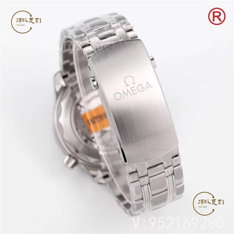 直徑42MM,厚度13.8MM。鏡面均使用藍寶石玻璃,非常通透。跟VS廠一樣。小小的一張字面布滿了當前市場最頂尖的制作工藝,刻度飽滿,字體清晰無毛刺,盤面做工細膩,做工體現出了OR廠是多么的努力。黑面沒有色差,其他顏色會存在一點點色差。指針的做工可以看到,打磨的很精細。條釘狀的刻度和指針都是采用了夜光粉填充,更加方便夜晚讀取時間。歐米茄標志的弧度,凹凸大小都做得非常棒。調歷方向是跟原裝相反的,原裝是拉出來把頭一檔,向下逆時針旋轉表冠來實現跳歷功能的,而OR廠和VS廠的都是向上順時針轉動表冠來調日歷的。把頭拉出來第二檔向下逆時針轉動表冠,調時間方向是跟原裝一樣的。上發條手感偏重一些。