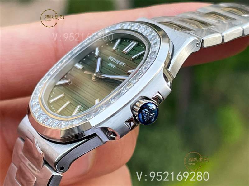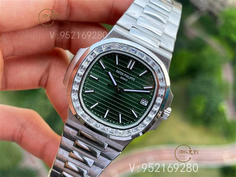 大家好,我是n廠手表小編,3k廠在推出324sc一體機之后,就成功占據了高端百達翡麗鸚鵡螺以及手雷的復刻市場,全力開發所有款式,在推出了3k廠鸚鵡螺綠盤5711之后,再次開發鉆圈版本綠盤鸚鵡螺復刻表,鑲嵌32顆頂級Wesselton長方形鉆石(約3.6克拉),按照珠寶工藝大師最高標準鑲嵌,令表身線條更顯出眾。當中精工細節:每顆長方形鉆石切割形狀特別略呈梯形,而非傳統長方形模樣,借此吻合八角形圓角表環輪廓。表面特色無與倫比,典型橫向凸紋裝飾,放射狀加工效果透現光華。白金小時刻度與巴頓式圓頭指針涂上夜光復合物料,確保日夜讀時清楚。表殼與綜合表鏈系在腕上恰到好處,穩妥舒適。全表可見人手拋光與磨拭加工元素細意交錯,倍顯線條交織效果。