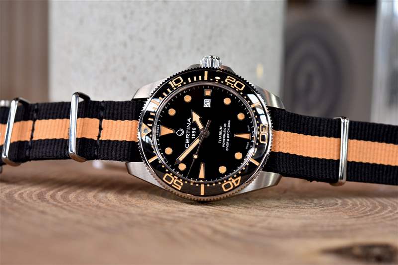正如我們?cè)谥暗奈恼庐?dāng)中所介紹過(guò)的那樣,這款風(fēng)格復(fù)古的潛水表采用全鈦金屬材質(zhì)打造,表盤(pán)使用的是黑色主題,上面點(diǎn)綴有米色的時(shí)標(biāo)和指針。由于是全鈦材質(zhì),所以上手感覺(jué)會(huì)非常舒適,而除了相稱的鈦金屬鏈帶之外,雪鐵納還提供了黑色/米色相間的NATO表帶(由#Tide海洋材料制成),對(duì)于炎炎夏日來(lái)說(shuō),還是后者搭配起來(lái)更有味道一些。該表款內(nèi)部搭載的同樣是斯沃琪集團(tuán)的Powermatic 80型機(jī)芯,可提供超長(zhǎng)的80小時(shí)動(dòng)力儲(chǔ)備。