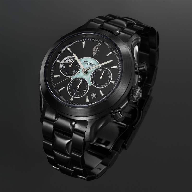 對于這件作品的主人公 Cloud,Seiko 選擇了光亮拋光的不銹鋼。人物的狼徽位于正面和中央,取代了 12 點鐘的刻度。在計時小表盤之間,珍珠母貝的內部表盤代表游戲中的行星生命力 Mako。最后的華麗是一頂藍寶石水晶王冠,靈感來自于游戲中的角色使用魔法的媒介 Materia。