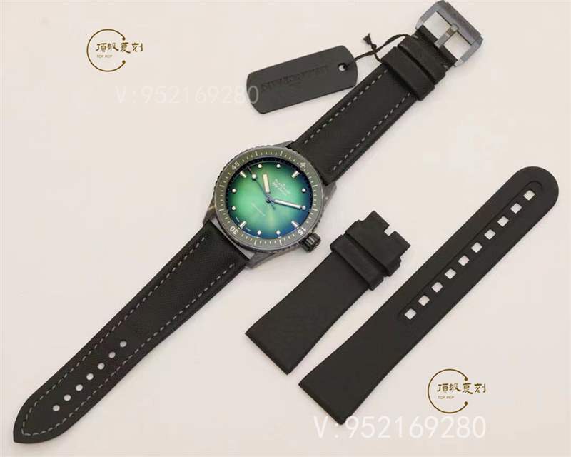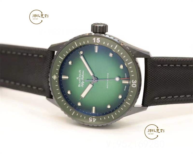 GF廠全新寶珀五十尋系列深潛器無溝雙髻鯊限量版腕表5005,極光綠表盤上,線條飾紋捕捉光線、折射異彩!深海極光,蘊藏極妙美感。43mm冷峻黑陶瓷外殼,強度高,極耐磨,動感色澤盡顯時尚張力!【附贈進口氟橡膠潛水表帶一副】