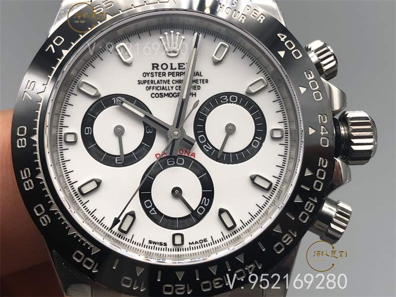 主要升級之處:圈口升級,V4版刻度相對于V3版更亮一些,更接近正品的色澤,而且這次采用物理氣相沉積技術(shù),將色油高溫涂覆在字體上,使圈口的競速刻度完全符合原裝的粗細,而且長時間佩戴根本不會掉色。字面,顏色為象牙白色,比之前更亮更好看;指針方面也是升級了實心中軸。狗頭、天平、750等貴金屬標志肉眼看上去和原裝幾乎沒有分別。表扣皇冠和扣身一體成型,而非點焊。N廠勞力士熊貓迪的配色是黑白相間,40毫米的表徑,不同手腕都可佩戴,整表的圈口、鏡面、內(nèi)罩、把頭、字面、指針和表扣均可與原裝通用。表殼以904精鋼材質(zhì)打造而成,相對于316鋼,在質(zhì)感上就有區(qū)別,并且904鋼材更加堅硬,耐刮花,耐磨性更好,抗腐蝕性也高,黑色的陶瓷材質(zhì)外圈,圈口上的刻度采用物理氣相沉積技術(shù),將色油高溫涂覆在字體上,使圈口的競速刻度符合原裝的粗細,而且做到不掉色、不褪色。圈口上面雕刻“units per hour”英文和數(shù)字,這里要和大家科普的是迪通拿的這一圈數(shù)字是測速用的,配合計時功能使用,算出每小時的速度。經(jīng)典蠔式密底設(shè)計,因為殼體底部要與皮膚接觸,所以采用環(huán)狀細紋拉絲處理,底蓋低平,倒梯狀,僅高2.5mm齒圈邊緣均做倒角處理,拋光打磨的精致毫無扯拉感。 此次V4勞力士熊貓迪用4130真正的一體機芯,沒有一片多余的甲板或者假齒輪,這也保證了表殼沒有超厚。機芯甲板的細紋和洗花精致細膩,字體清晰深刻,計時歸零干脆有力,功能對版。同樣配置原裝的KIF避震器,藍色游絲。