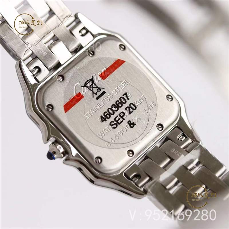 GF版本1:1還原正品底蓋刻字大小、深淺以及順序,所有配件可與正品替換使用。底蓋上攜刻著卡地亞英文標示的下方,WATER RESISTANT 更是對腕表防水性能的保障,石英表基本都是生活防水,還請不要游泳時佩戴。