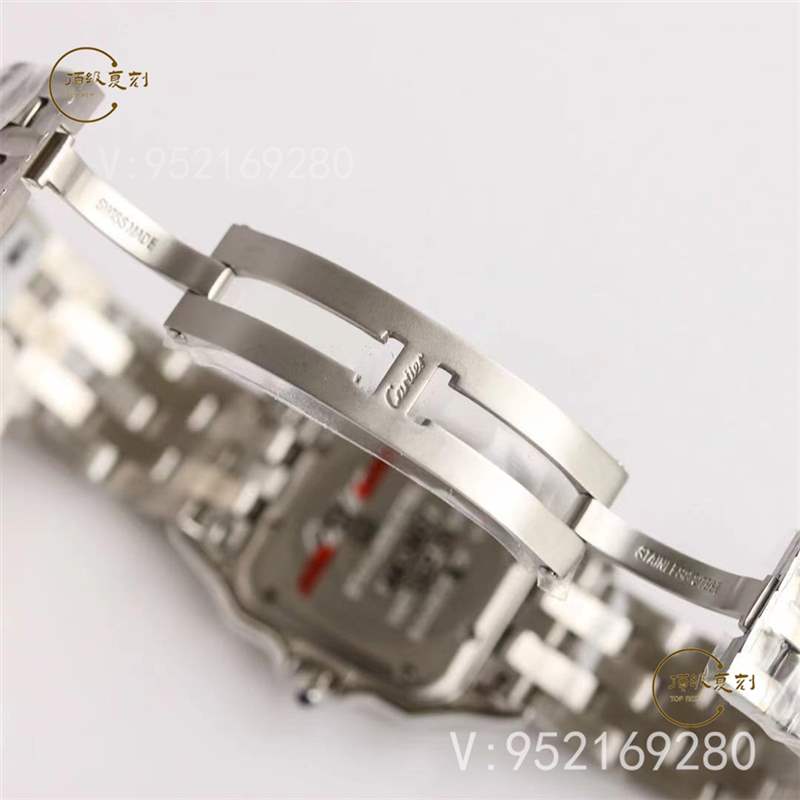 GF廠采用1:1正品開模,屬于Panthère de Cartier獵豹系列的中號表款,尺寸為長37毫米,寬27毫米。拆開表帶,頭粒,與正品放一起,孰真孰假,很難分辨,外觀還原程度極高 。