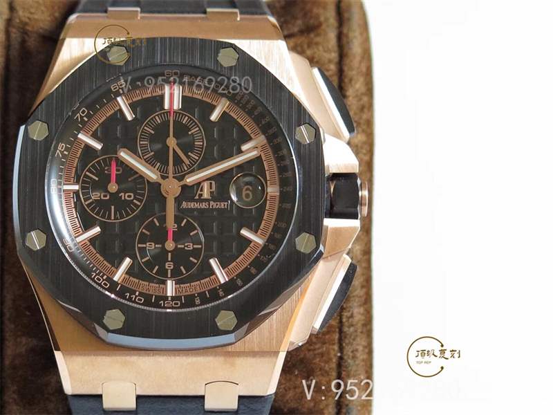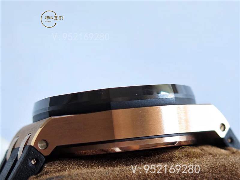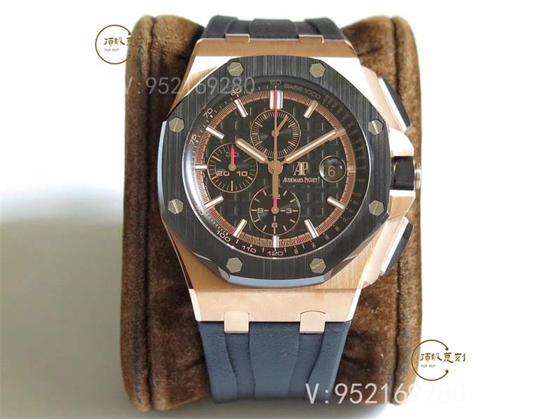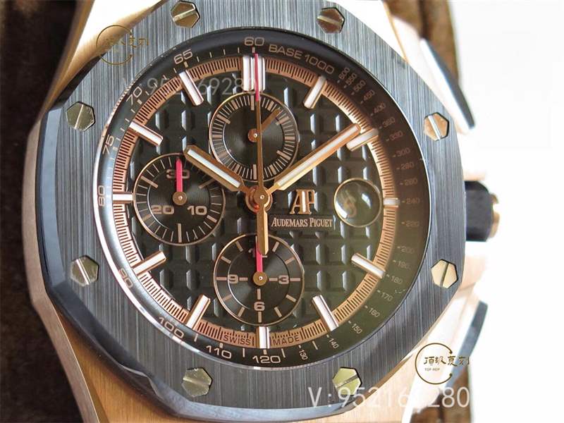 JF最新出品的愛彼皇家橡樹離岸型系列26470OR.OO.1000OR.01腕表,背透完美復刻了原版的3126機芯樣式,正反面藍寶石鏡面,表殼的黑材質部分都是陶瓷工藝,非常耐磨,原裝針扣設計,黑色+玫瑰金的組合非常搶眼,做工完全可以PK原廠。