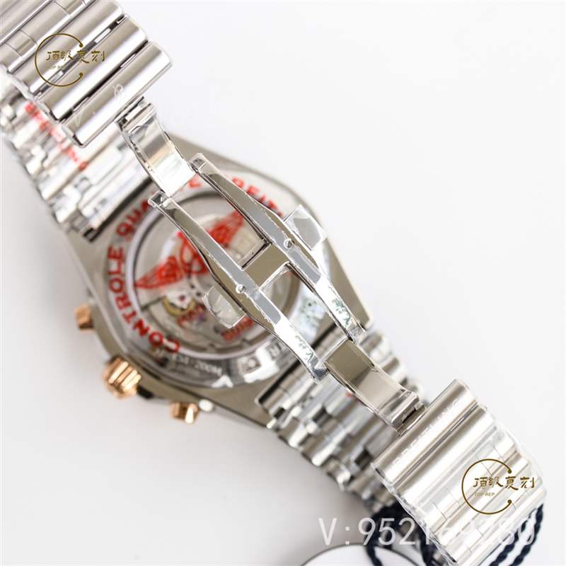 三個白色CD紋理的小表盤,3點位是30分鐘計時盤,9點位是獨立的小秒盤,6點位是12小時計時盤。停在12點位置的大秒針是計時用的,不是平常走時的秒針。玫瑰金色的條釘的光澤上根本都做到了與正品共同的效果,釘腳選用固定式,不易脫落!并且GF廠的電鍍玫瑰金制作工藝技術還是非常成熟可靠的!