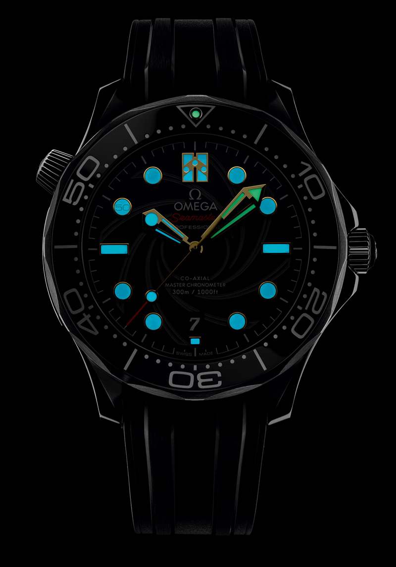 作為對(duì)比,子彈、指針和 12 點(diǎn)鐘位置的邦德家族徽章均采用 18K 黃金制成。更微妙的是,如果你在黑暗中看表盤(pán),你會(huì)在 10 點(diǎn)鐘位置的時(shí)標(biāo)上看到一個(gè)小秘密:夜光 50。