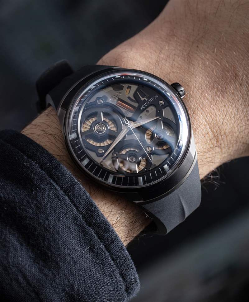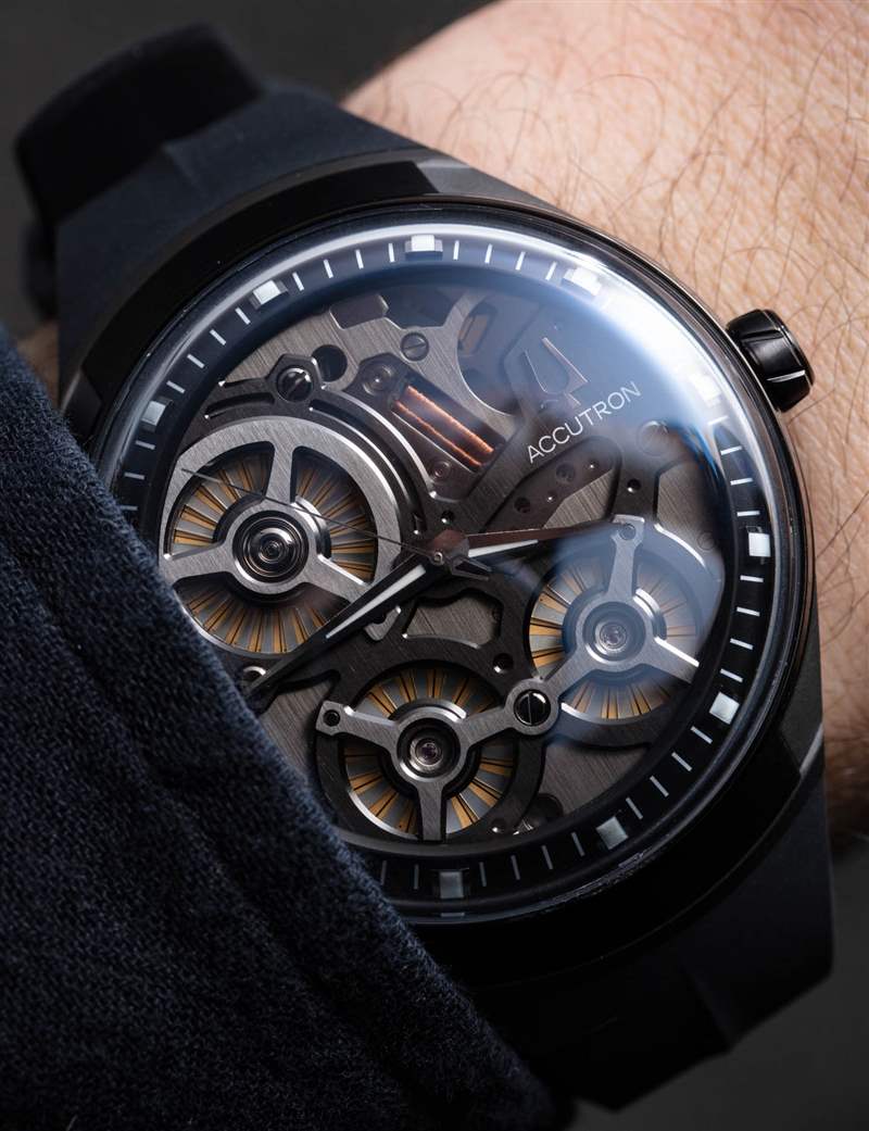 Spaceview 靜電運(yùn)動(dòng)有兩個(gè)小型渦輪式轉(zhuǎn)子,它們隨著手腕的運(yùn)動(dòng)而移動(dòng)以產(chǎn)生能量。他們不是通過(guò)直接連接的齒輪來(lái)驅(qū)動(dòng)傳統(tǒng)發(fā)電機(jī)。相反,它們產(chǎn)生靜電能量,然后通過(guò)雙電極捕獲并發(fā)送到蓄電池,這是為計(jì)時(shí)系統(tǒng)供電的電力來(lái)源。我沒有戴過(guò)手表,所以我真的不明白它在電池壽命方面的表現(xiàn)如何(Accutron 現(xiàn)在并沒有真正談?wù)撨@個(gè))。然而,Accutron 確實(shí)承諾每個(gè)月的準(zhǔn)確度在 5 秒以內(nèi)——這比標(biāo)準(zhǔn)石英機(jī)芯的準(zhǔn)確度大約高出兩到三倍,盡管它不如Citizen Calibre 0100準(zhǔn)確度(更高端)和 Bulova Precisionist(更實(shí)惠),它們都是同一公司的一部分。