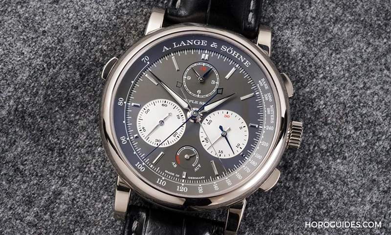 Triple Split的灰色表盤上,3點鐘方向為30分鐘積分盤而12點鐘方向的則是12小時積時盤,在表盤9點鐘方向的是具有停秒裝置的小秒盤,6點鐘方向則為動力儲能顯示。在追針表的表盤上可以見到兩種色調(diào)的指針以作分辨,而朗格Triple Split也特別以藍鋼指針作為追針,在表盤最外圈也可看到計速刻度。