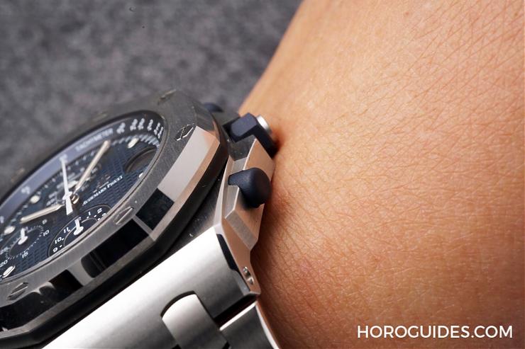 表款為不銹鋼材質(zhì)、42mm表徑、定價為CHF 25,000(約為臺幣76萬1000、港幣19萬9000),經(jīng)典的八角形表圈以拉絲打磨處理、邊緣為亮面拋光,鎖上亮面的六角螺絲,表冠與計時按鈕為深藍(lán)色的橡膠材質(zhì)。