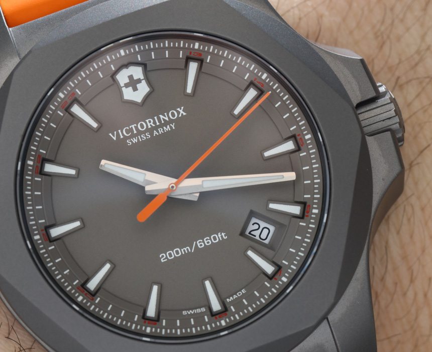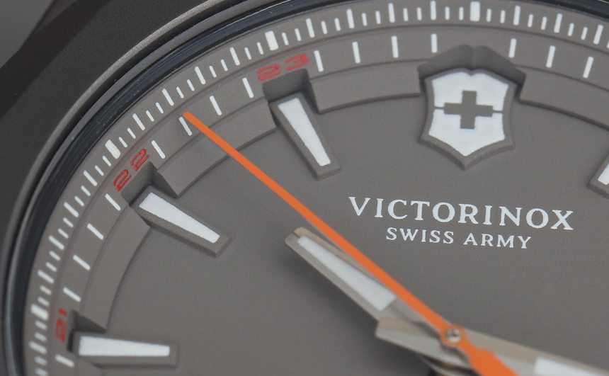 與標(biāo)準(zhǔn) INOX 的拉絲和拋光鋼表殼不同,Victorinox Swiss Army 采用全噴砂處理鈦金屬表殼。我有一種感覺(jué),這是 2 級(jí)和 5 級(jí)鈦金屬,這實(shí)際上很有趣,因?yàn)?INOX 式表殼的清晰角度和精確曲線做得非常好。與鋼相比,鈦的灰色外觀也在設(shè)計(jì)中得到了強(qiáng)調(diào)。此外,表殼的啞光處理流向表盤,為這款生活方式運(yùn)動(dòng)手表帶來(lái)更加清醒、工具風(fēng)格的外觀。