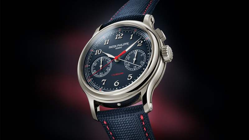 乍一看,這看起來像是一款絕對經典的鉑金雙刻度計時碼表(六點鐘位置的表耳之間有一顆小鉆石,就像所有百達翡麗鉑金手表一樣)。乍一看是計時碼表秒針的紅色中央指針看起來有點不尋常,尤其是在深藍色表盤的映襯下,但除此之外,這很可能是 1952 年和 2022 年的百達翡麗計時碼表。然而,仔細觀察, 你注意到實際上有兩個計時碼表的中心指針,表盤上用小的、不同的字母顯示“1/10 秒”——然后外部經過的秒數刻度實際上是兩個刻度,一個刻度表示經過的秒數(和分鐘數) ,當從分針上讀取時)和一個外部的,有 12 個紅色索引,旨在讓您從紅色中央計時指針讀取 1/10 秒的增量。紅色計時指針每 12 秒繞表盤轉動一圈。