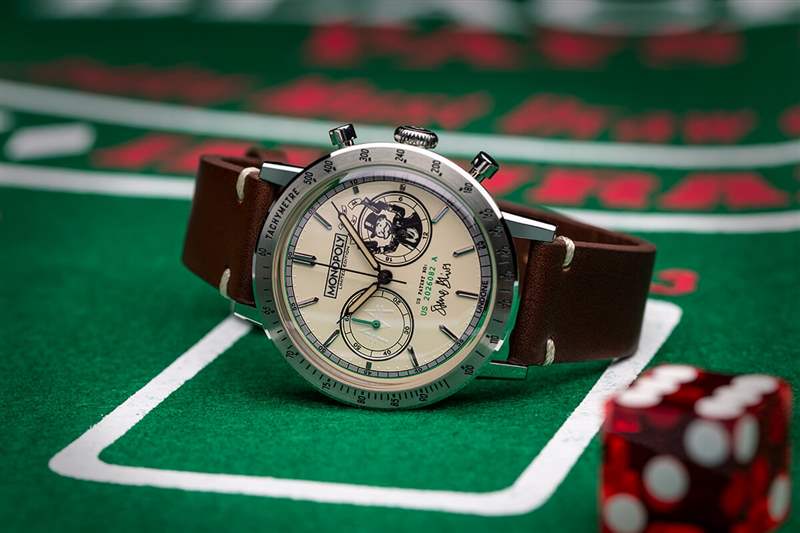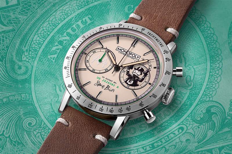 合作中的第二款手表更加賺錢,雖然在金錢的顏色上更字面意義上,就像你可以戴在手腕上的鈔票一樣。恰如其分地被稱為本杰明,這個在右側子表盤上有錢袋叔叔,左邊是壟斷貨幣符號。6 點鐘,Bliss 借出他的簽名(而不是財政部)來完成外觀。
