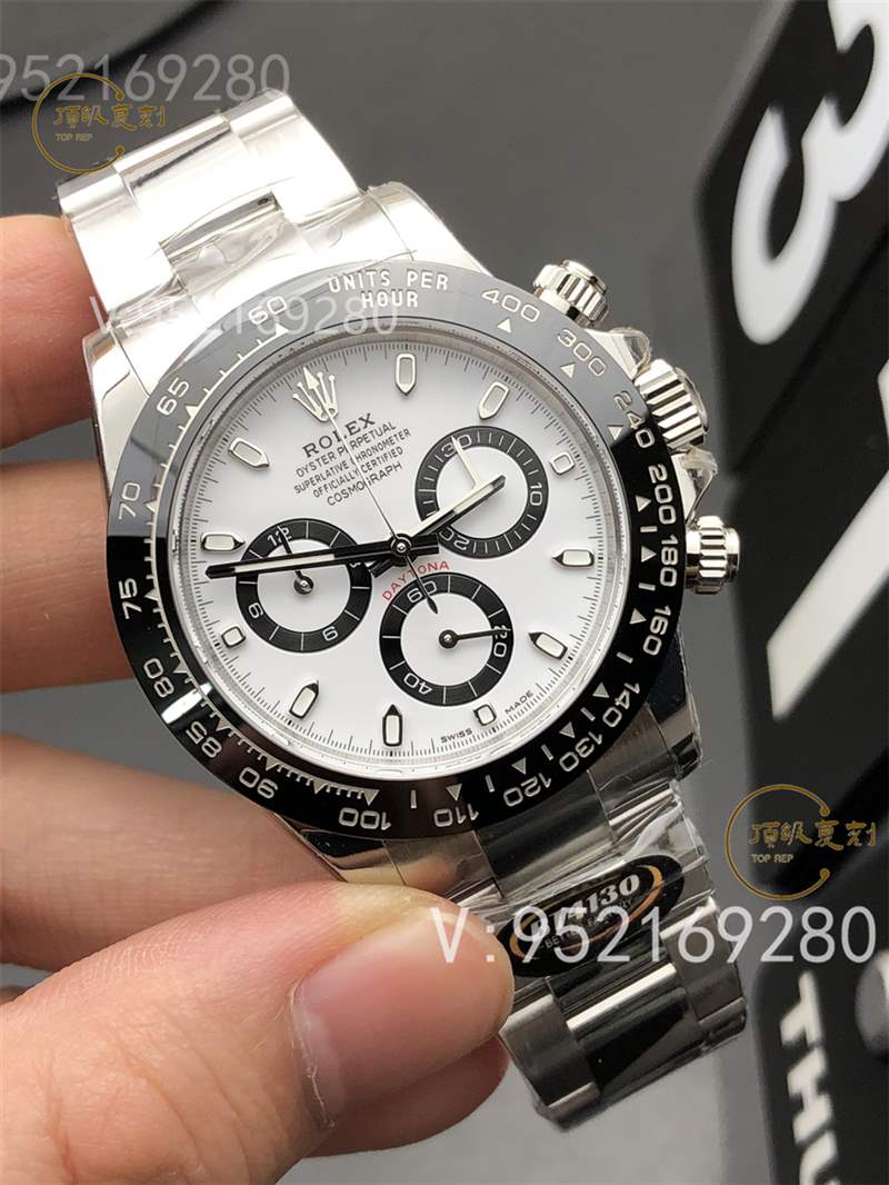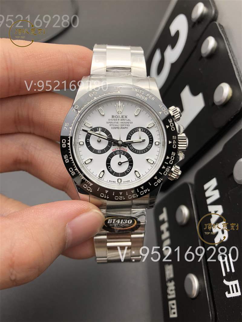 2,盤面細節:字面對照2022最新版白面,采用瑞士油墨加韓國陶瓷調制打磨做到有厚質感純乳白色與原版無色差;字體,我們看到的圖片都是手機實拍,不存在加工處理。品牌LOGO金屬高拋光,光澤亮麗,開口正確;盤面字體油墨均勻,平滑立體無外溢,所有刻度釘均是CNC雕刻而成,并且經過打磨處理,看上去潤滑光亮;賽道圓環清晰立體,無雜質痕跡,且數字形態無折痕。