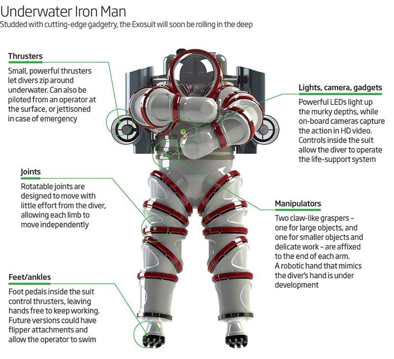 Exosuit 非常糟糕,老實說,當(dāng)你讓工程師自由設(shè)計不需要預(yù)算的東西時就會發(fā)生這種情況。Exosuit 或多或少是一種可穿戴的潛水服,主要由鋁制成,并包含生命維持系統(tǒng)。有趣的是,它并不是為了潛水那么深而設(shè)計的,而是讓潛水員可以在水下停留很長時間,而不必?fù)?dān)心氧氣不足或減壓問題。Exosuit 是大氣套裝,這意味著內(nèi)部壓力與表面壓力大致相同。所以回來的潛水員不需要減壓以避免彎曲。