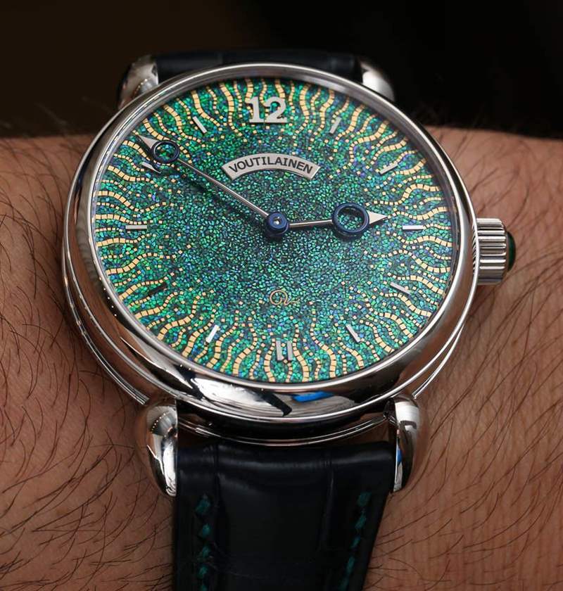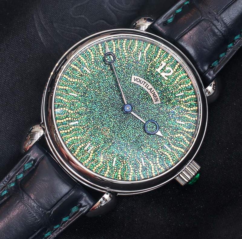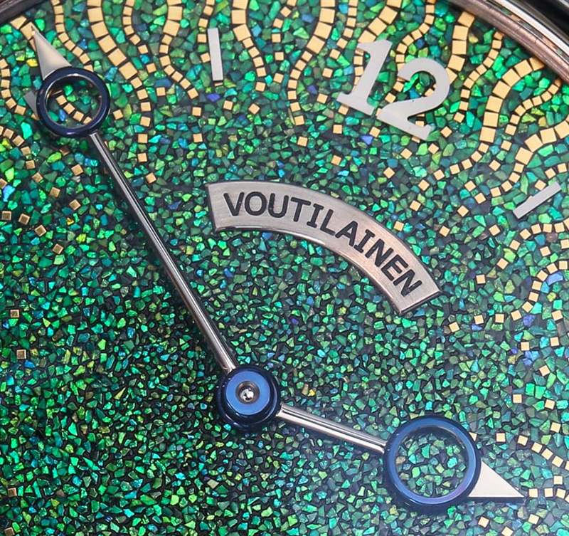 這不是Kari Voutilainen第一次與日本國(guó)寶和傳奇漆器藝術(shù)家 Kitamura Tatsuo(也稱為“Unryuan”)合作。Kitamura 的工藝品有多種不同的形式,當(dāng)他與 Voutilainen 合作時(shí),通常是精心手工組裝的馬賽克表盤,這些表盤結(jié)合了黃金和軟體動(dòng)物貝殼等一系列自然元素和材料。這款手表叫做 Voutilainen 28 Hisui,在日語(yǔ)中是玉的意思,看看 Voutilainen 28 Hisui 的表盤顏色,就很容易看出原因了。