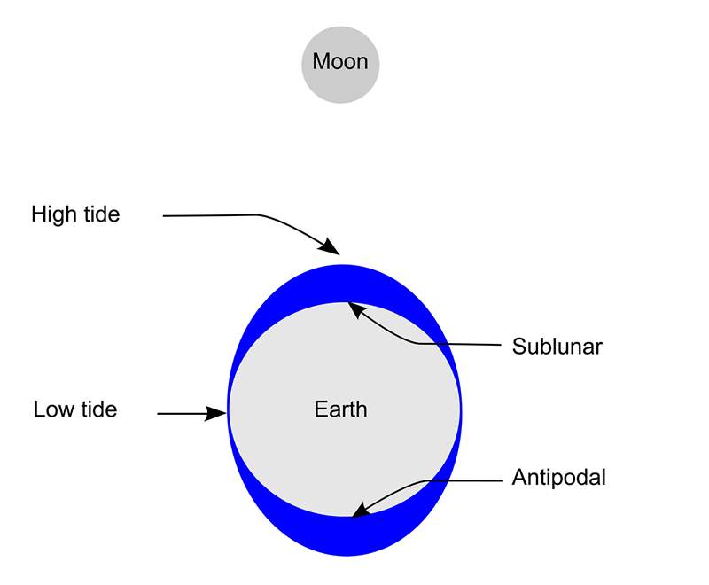 示意圖顯示了相對于月球位置的潮汐隆起。圖片來自維基共享資源。