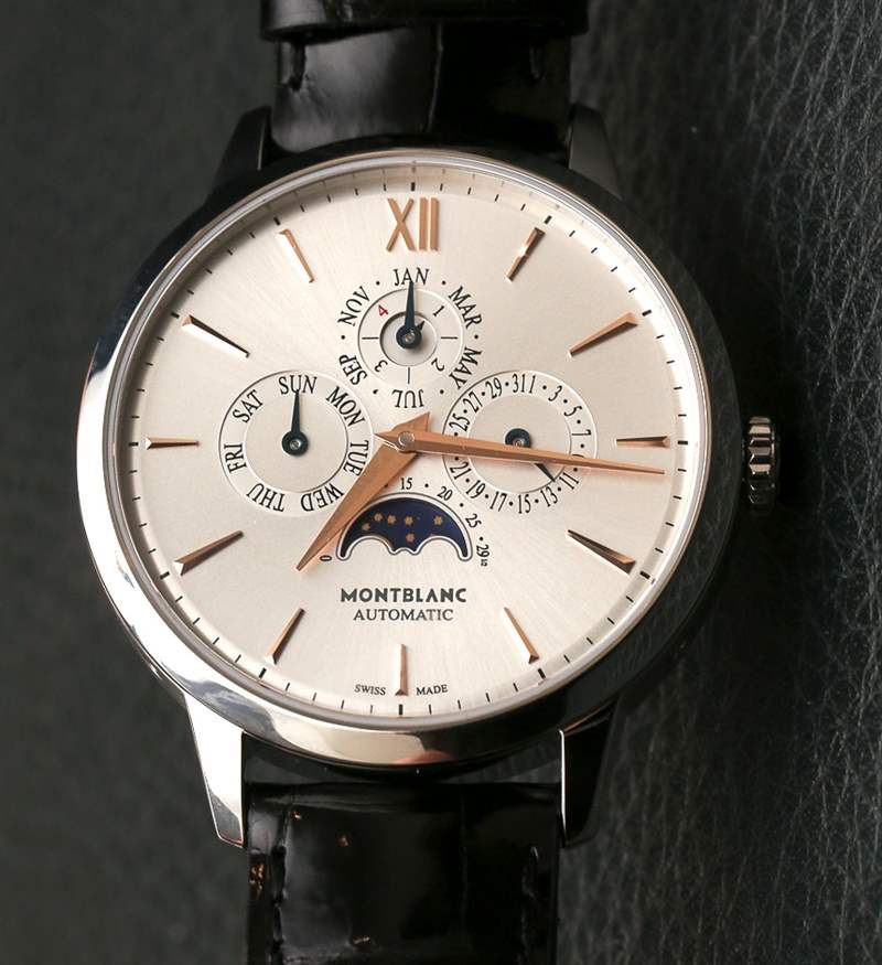萬年歷 39 毫米寬,厚度僅約 10 毫米。鑒于機芯是帶模塊的底座,這非常好。Monblanc 將提供精鋼和 18k 玫瑰金萬年歷。真正的價值當(dāng)然在于帶有玫瑰金指針和小時市場貼花的精鋼表殼。這將是一個萬年歷——一個不錯的——價格是大多數(shù)人以前從未見過的。