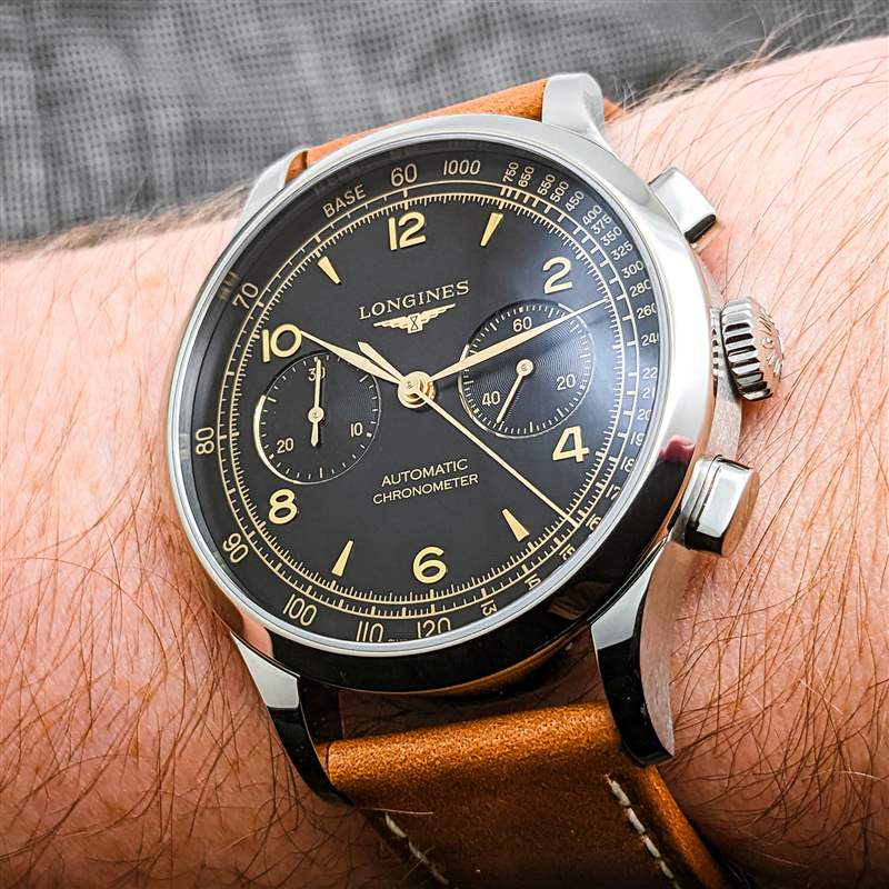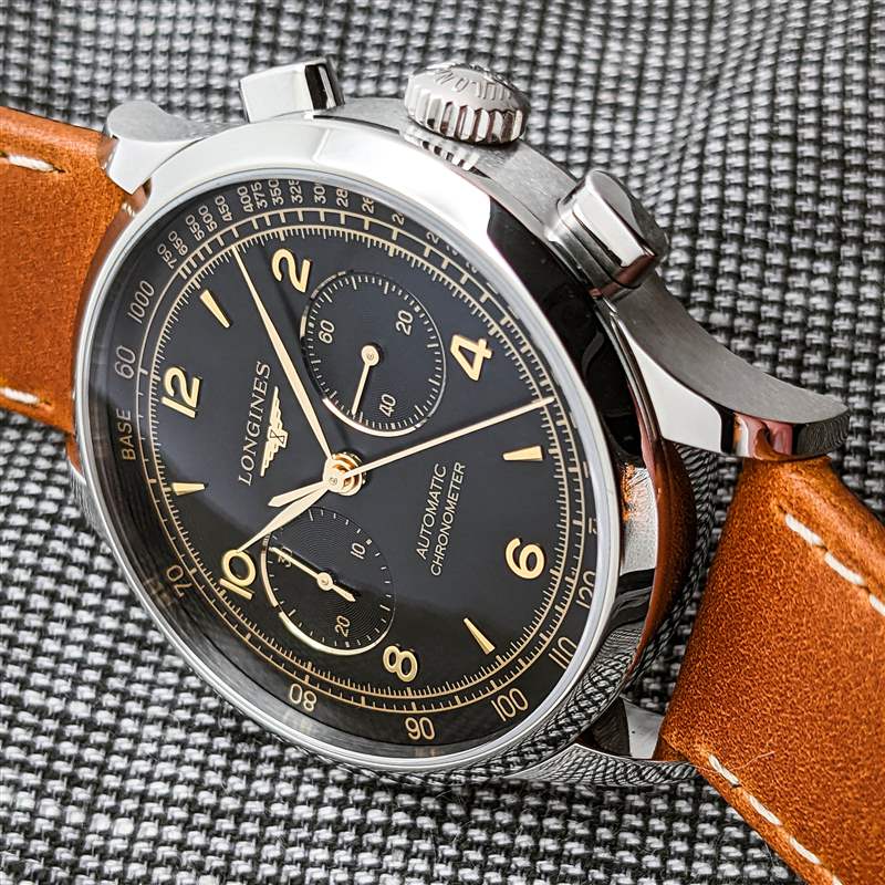 與安靜成長(zhǎng)的 30 年代/40 年代計(jì)時(shí)碼表領(lǐng)域中的大多數(shù)競(jìng)爭(zhēng)對(duì)手相比,浪琴表 Record Heritage 提供了非常干凈和內(nèi)斂的表盤(pán)設(shè)計(jì)。浪琴 (Longines) 對(duì)復(fù)古風(fēng)格的啞光黑色表盤(pán)并不陌生,Record Heritage 表盤(pán)光滑、均勻的飾面賦予其干凈、經(jīng)典的外觀,而不會(huì)給人以古銅色的印象。話(huà)雖如此,由于其小表盤(pán)刻度、徽標(biāo)以及測(cè)速計(jì)刻度和計(jì)時(shí)碼表秒軌道的雙外圈的鍍金表盤(pán)文字,表盤(pán)仍然提供了充足的視覺(jué)溫暖。在保持 40 年代的設(shè)計(jì)感及其迷人的視覺(jué)復(fù)雜性的同時(shí),這些外部刻度還將表盤(pán)設(shè)計(jì)的其余部分壓縮到更小的區(qū)域,進(jìn)一步增強(qiáng)手腕上的緊湊感。然而,真正吸引眼球的是金色表盤(pán)硬件。實(shí)用的阿拉伯?dāng)?shù)字和楔形索引的組合明亮而迷人的老式風(fēng)格,優(yōu)雅纖薄的葉子手機(jī)也是如此。雙凹陷子表盤(pán)周?chē)慕鹕b飾環(huán)讓 Record Heritage 在手腕上看起來(lái)更加閃亮,同時(shí)自然地將眼睛吸引到那里的關(guān)鍵信息。Longines 選擇用 azurage 完成這些子表盤(pán),讓大部分啞光設(shè)計(jì)在不斷變化的光線(xiàn)下也有一點(diǎn)活力。盡管整體布局優(yōu)雅、精致且視覺(jué)平衡令人印象深刻,但 Record Heritage 的易讀性可能是愛(ài)好者爭(zhēng)論的焦點(diǎn)。精美印刷的計(jì)時(shí)秒針刻度,葉子聽(tīng)筒的纖細(xì)尖端,