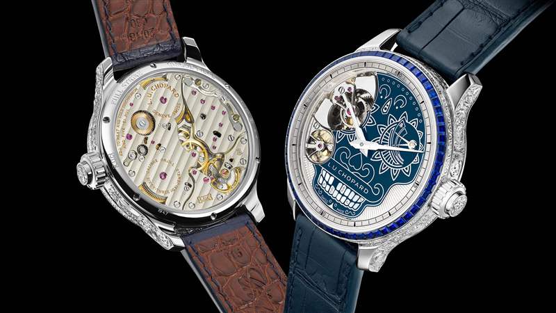 手表的制作和組裝分幾個步驟進行。表殼由 18k 白金(通過蕭邦的道德黃金供應鏈采購)制成,并在表殼帶上精心雕刻了以亡靈節為靈感的圖案,包括卡拉維拉斯、風格化的吉他和花卉設計。雕刻非常復雜,延伸到表耳,當然還有表冠,表冠也飾有卡拉維拉。
