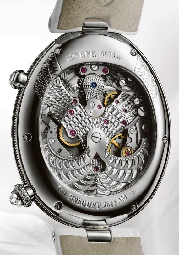 翻開手表,我的脈搏就會跳動。高級制表的標志之一是機芯與表殼貼合,就像一只手滑入完美定制的手套中一樣。寶璣專門設(shè)計了自動蛋形機芯,以舒適地適應(yīng)這個空間。令人嘆為觀止的是,透過藍寶石水晶玻璃可以看到的機芯既是藝術(shù)成就,也是機械成就。橋板和擺陀形成鴿子的圖像,設(shè)計延伸到表殼上的雕刻。正如你所說,我對手表的背面比正面更著迷。