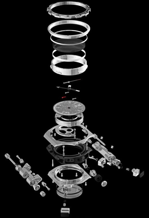 很難說的一件事是,外殼的中間部分實際上全是黑色的——全是DLC黑色的。現在甚至寶格麗也加入了DLC的行列。又是一波告別PVD。只是這個復雜案件的一部分。下面您將看到表殼的“爆炸”圖像 – 由104個部分組成。我喜歡有些表殼是 2 或 3 個部分,有些是 100 多個零件。?最復雜的案件贏家仍然是Nubeo Black Mamba。Diagono X-Pro寬45毫米,表殼由鋼,DLC涂層鋼和鈦制成。表冠和計時按鈕(除橡膠表帶外)上也有橡膠涂層。手表的正面和背面都有藍寶石水晶(前水晶是高度AR涂層的)。