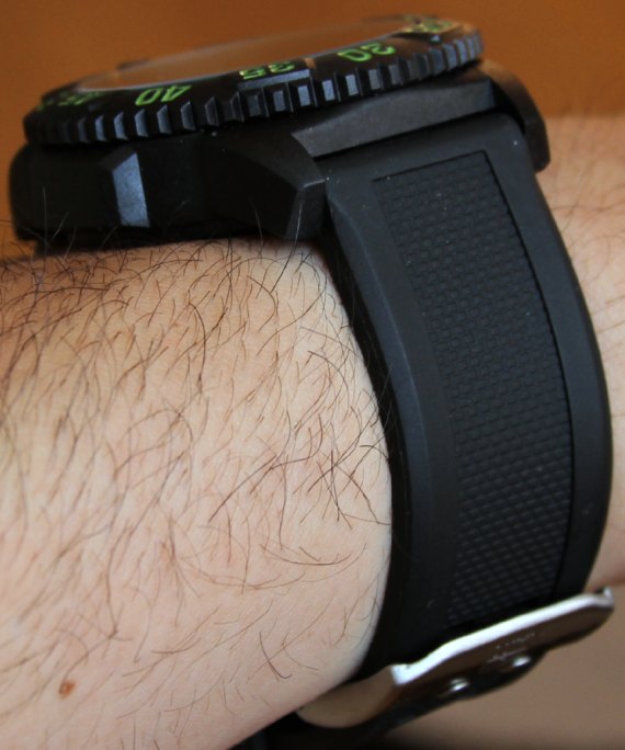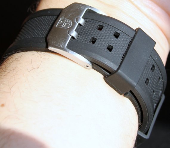 我真的很喜歡橡膠表帶的尺寸和手感。它具有金屬雙銷式搭扣,并具有厚實,堅固和紋理的感覺。Luminox選擇不用黑色涂層金屬表扣來包裝黑色表殼,而是使用帶有Luminox標(biāo)志的拉絲金屬表扣。老實說,我一點也不介意顏色差異。