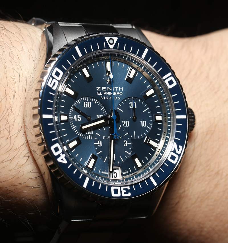 與往常一樣,Zenith Stratos 腕表的寬度為 45.5 毫米,此版本同樣采用精鋼表殼。仔細(xì)想想,18k 玫瑰金搭配藍(lán)色表圈和表盤(pán)會(huì)顯得非常有趣。表圈再次采用陶瓷材質(zhì),并為分鐘指示器涂上了蝕刻部分。我之前提到過(guò)這一點(diǎn),但值得注意的是旋轉(zhuǎn)表圈稍微向內(nèi)傾斜,這使得陶瓷表圈嵌件的生產(chǎn)更具挑戰(zhàn)性。大膽的表盤(pán)非常清晰易讀,指針大小合適,涂有 lume 涂層。考慮到軍事外觀和拋光元素的混合,我認(rèn)為 Stratos 是一款非常漂亮的運(yùn)動(dòng)手表……不可否認(rèn),它仍然是一款運(yùn)動(dòng)手表。