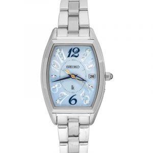 Lukia可算是精工表中最受歡迎的女士手表系列,專為年輕職場女士而設計,造型大方而優雅。此表別致地以酒桶形表殼襯上精鋼表鏈,淺藍表面綴以深藍指針,時標則為深藍與白色的數字配搭,再襯有幾顆碎石,在平凡中盡顯閃爍之色,配搭各類衣著亦見相宜。