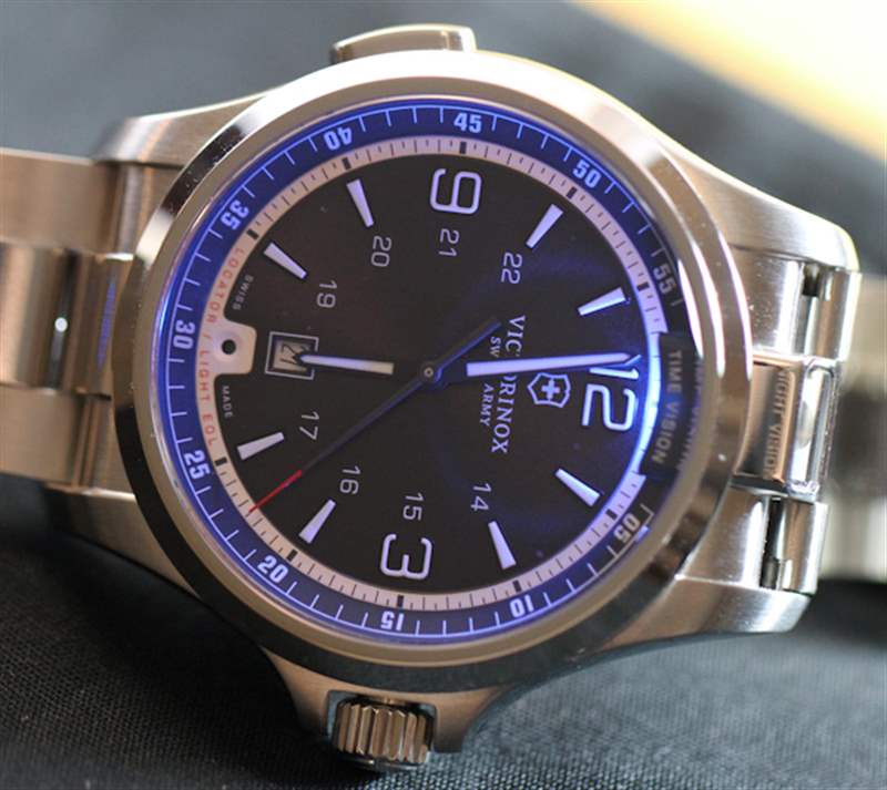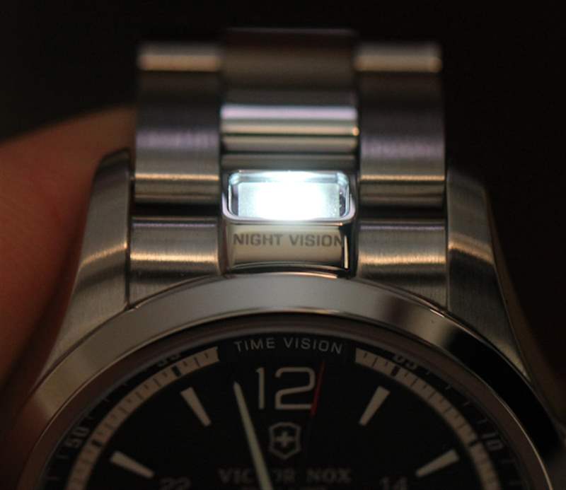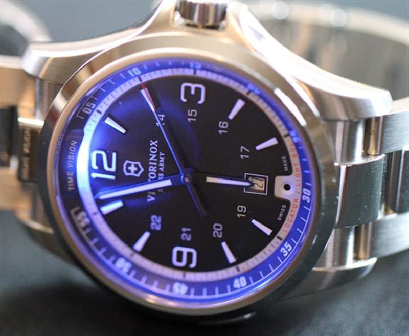 閃爍的紅色 LED 燈是 Night Vision 手表上的三個 LED 燈之一。第二個位于手表另一側 12 點鐘位置的旁邊。這是一個藍色 LED,具有點亮表盤的獨特功能。只需按一下燈按鈕即可激活此燈幾秒鐘,時間足以讀取表盤。Victorinox Swiss Army 在指針和時標上也放置了發光體,這是一些受歡迎的冗余。這意味著即使沒有激活藍色 LED 燈,您也很有可能能夠在弱光下閱讀手表。與現在用于在黑暗中照亮手表表盤的其他一些 LED 燈不同,夜視儀上的 LED 燈效果非常好,可以提供完整的表盤視圖。其他設計欠佳的手表的 LED 無法提供足夠的光線?!癟ime Vision”這個標簽相當直接地定義了它結束的光的目的 – 當你大聲說出來時有點迷人俗氣。地獄,我也想要“時間愿景”。