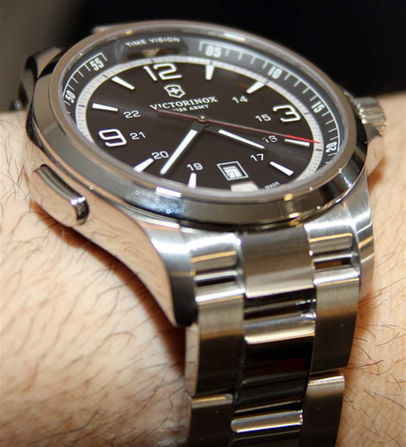 Victorinox Swiss Army 提供兩種表盤顏色(淺色或深色)的夜視儀,并配備鋼表鏈或皮革表帶。我認為大多數瑞士軍迷都會想要像樣的手鐲。寬手鐲很保守,有助于防止手表看起來太小。它具有蝴蝶式展開裝置和安全扣。它不是高端感覺的縮影,但關閉時非常堅固。沒有什么比一個脆弱的扣環更糟糕的了。