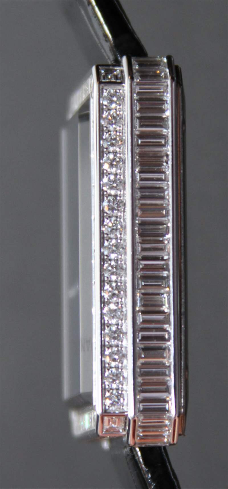 Première Tourbillon Volant 采用 18k 白金表殼,高 37 毫米,寬 28.5 毫米。它上面滿是鉆石。表圈鑲有 3.9 克拉的鉆石,由 38 顆長方形切割寶石和 52 顆明亮式切割寶石組成。表殼的其余部分還有 3 克拉的 47 顆長方形切割鉆石。18k 白金表扣、表冠以及花型飛行陀飛輪框架的頂端均鑲嵌著更多鉆石。哦,別忘了手上的鉆石——你不會經常看到。廣告留言廣告信息結束